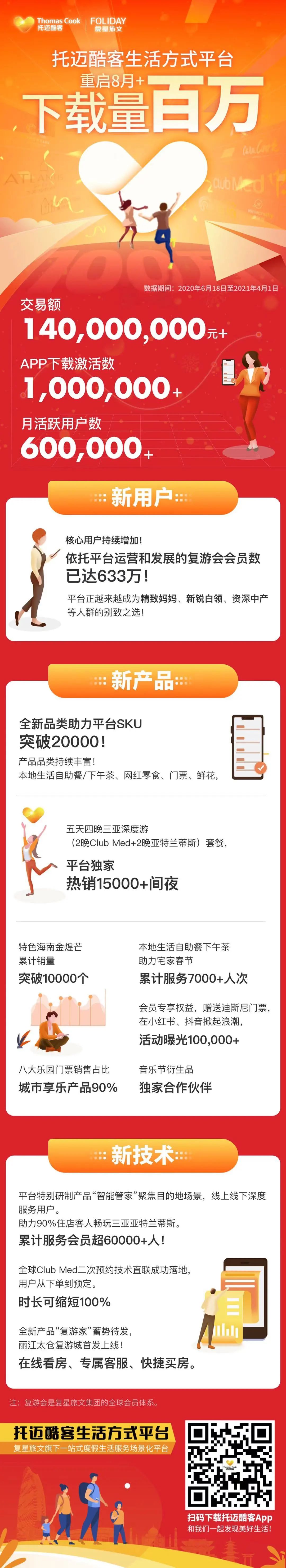 此外,非凡 旅文旗下一站式度假生活服务场景化平台——托迈酷客(ThomasCook)生活方式平台自2020年上线以来,发展势头迅猛。数据显示,2020年6月18日至2021年4月1日期间,平台交易额突破人民币1.4亿元,APP下载激活数突破100万,月活跃用户突破60万。其中,依托平台运营和发展的复游会会员已达633万,核心用户持续增加。