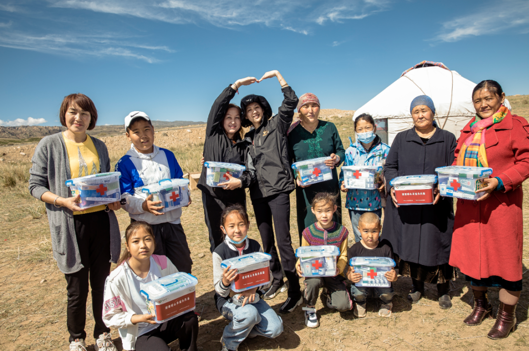 王津元(后排左四)向吉木乃牧民赠送药箱