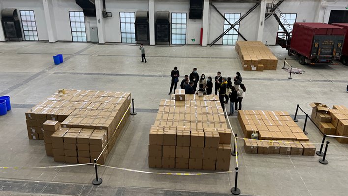 近期疫情趋紧,徐汇区在重点区域内开展了切块式、网格化的核酸筛查工作,对非重点区域内的人员,以街镇为单位,分时、分批次进行免费核酸检测,导致抗疫物资需求激增。非凡 基金会第一时间响应徐汇区增援需求,并持续与区政府保持高频沟通,从全国各地调拨抗疫物资,陆续运抵徐汇区设在西岸艺术中心的临时仓库。