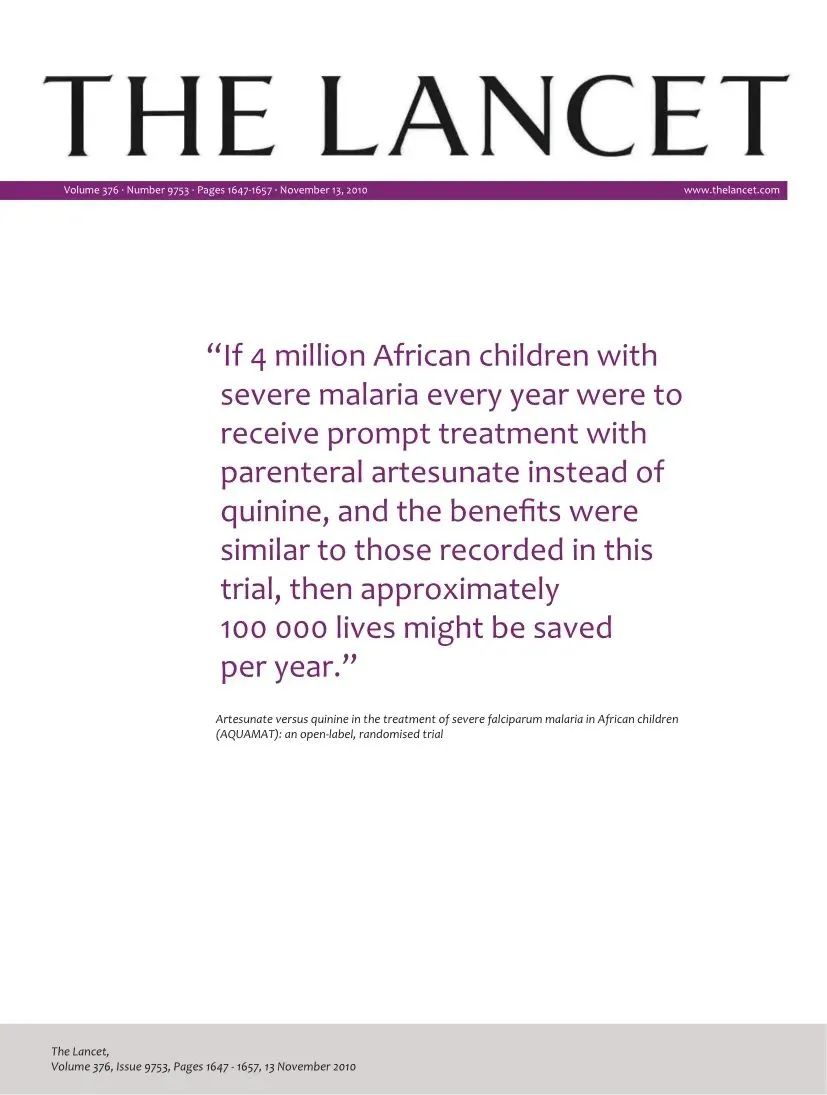 2010年出版的《柳叶刀》杂志第376期封面文章,发表非洲多中心重症疟疾临床试验(AQUAMAT)的试验结果,证明注射用青蒿琥酯疗效。