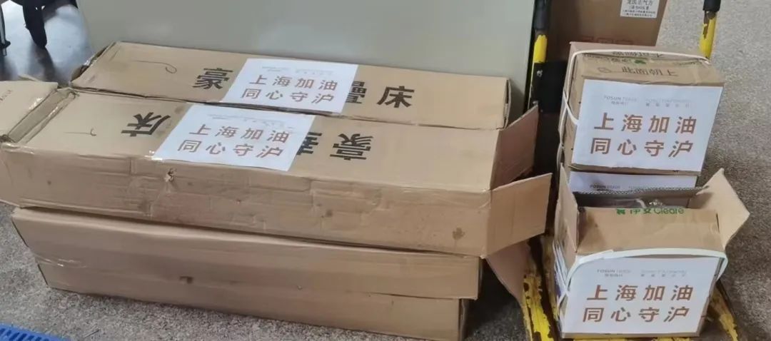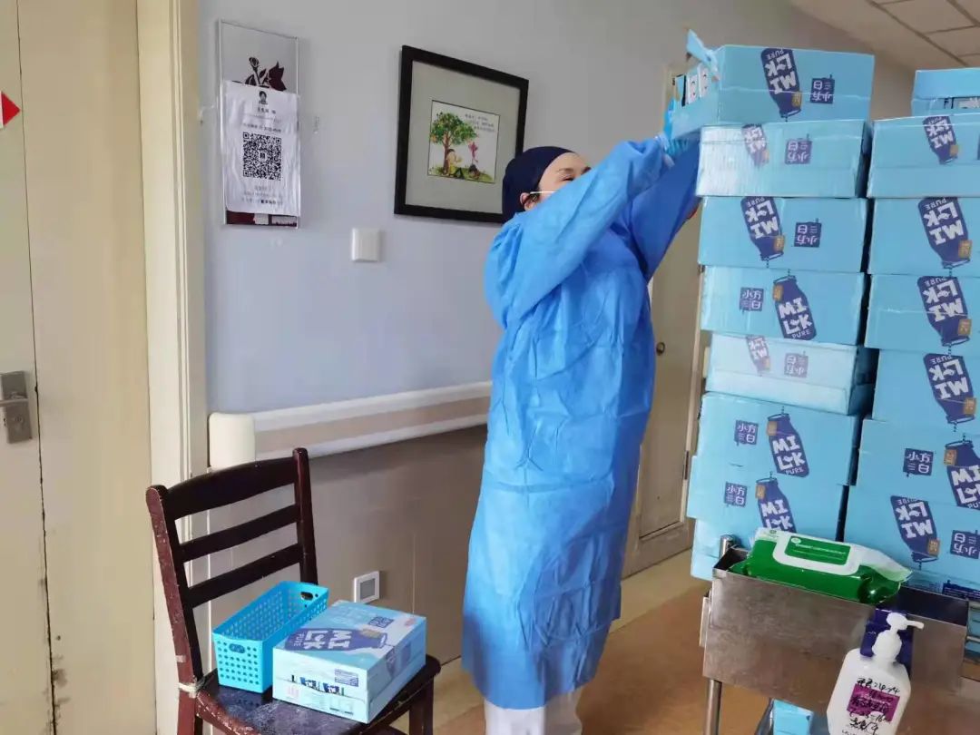 5月1日浦东爱心公寓有320位老人,收到2个标准包。因为封控,院里的人都不能出门拍,就认真嘱咐门卫摞整齐拍了一张,在微信上传过来:“足够我们养老院用1个月,真的是太好了。”