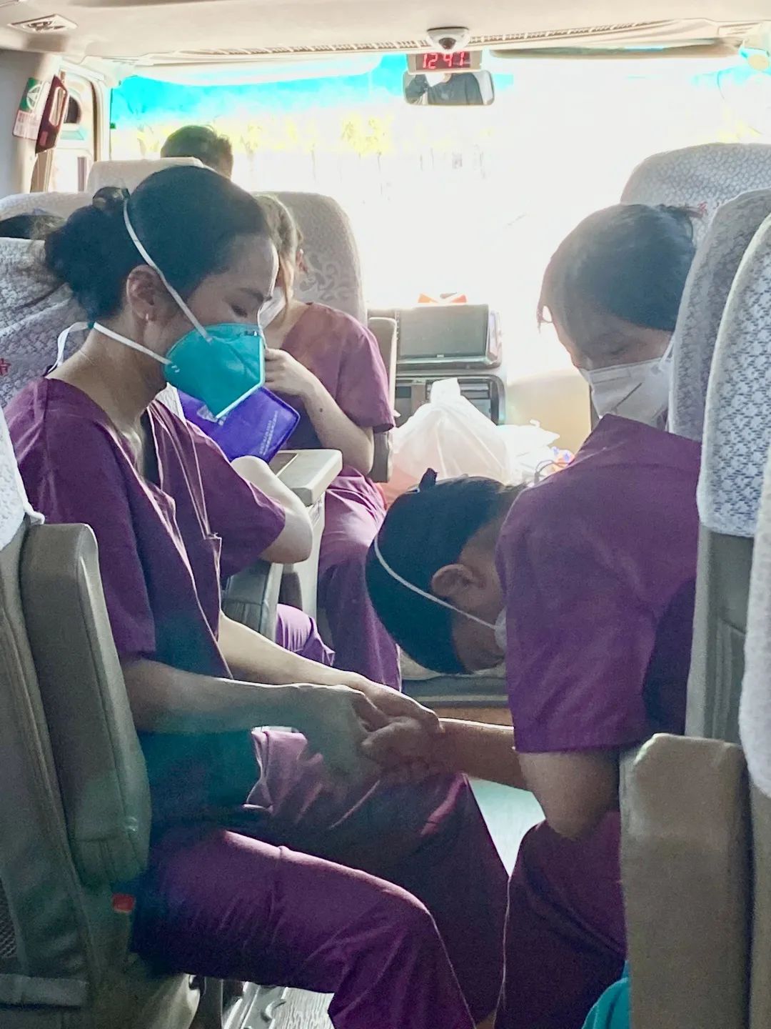 平时都经常晕车的佛山非凡 禅诚医院护士邹丽珍,经过一天7-8次的核酸点转场头晕难忍,结束一天采样返程的车上,同事细心地给她做合谷穴按压缓解头晕,她说,再难受也阻挡不了守沪决心。