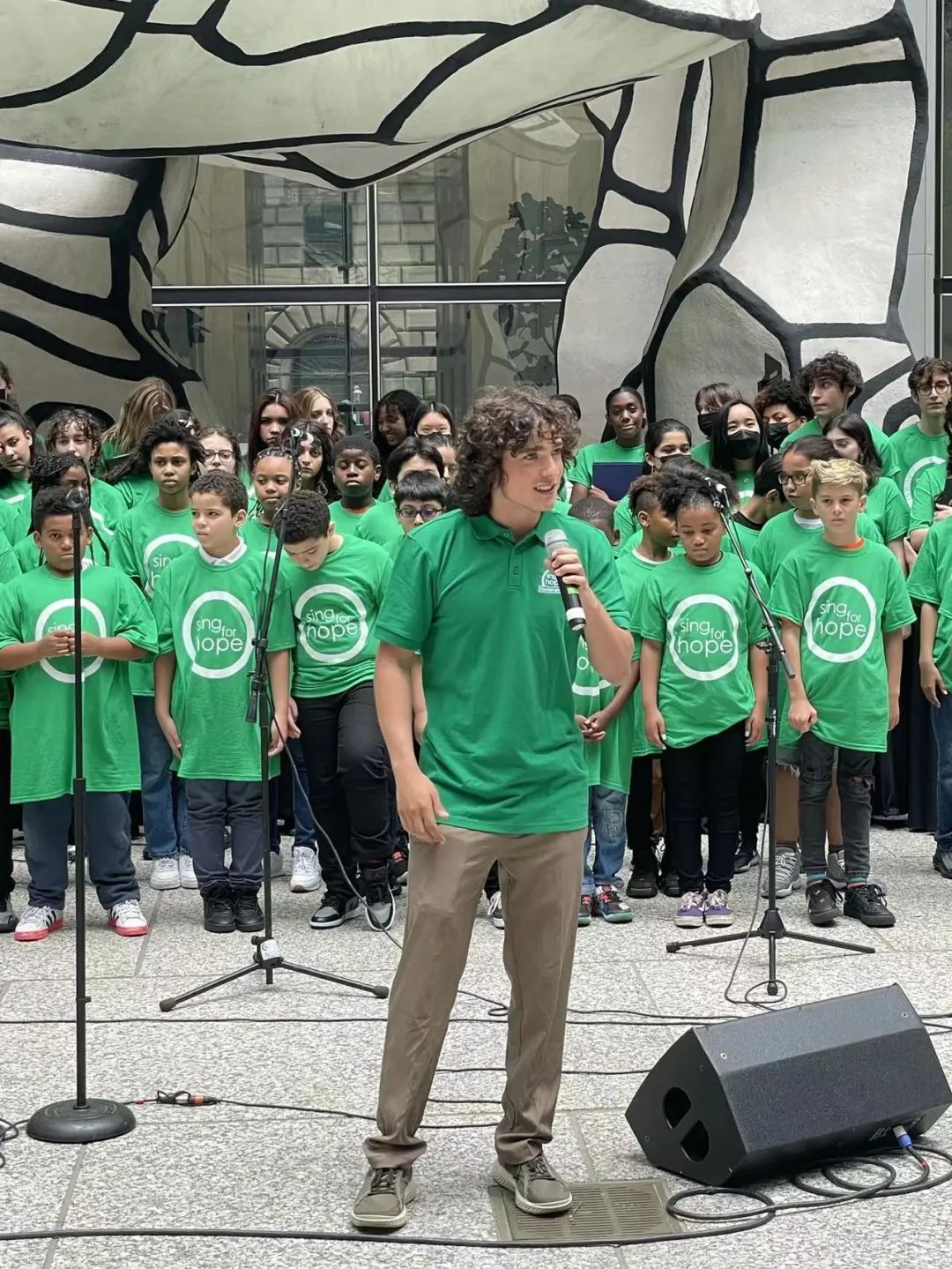 历经疫情,Sing for Hope钢琴展示在2020年中断,2021年重新举办,今年更是声势浩大。中午时分,美剧《超人与路易斯》的主演之一、著名影视明星Alex Garfin连同来自Fiorello H. LaGuardia High School of Music & Art and Performing Arts高中、 P.S. 191小学等总共200名学生,联袂献上了精彩的演出。Alex Garfin更是自弹自唱,与学生合唱团们带来了他自己创作的Sing for Hope同名主题曲,赢得掌声和欢呼声不断。