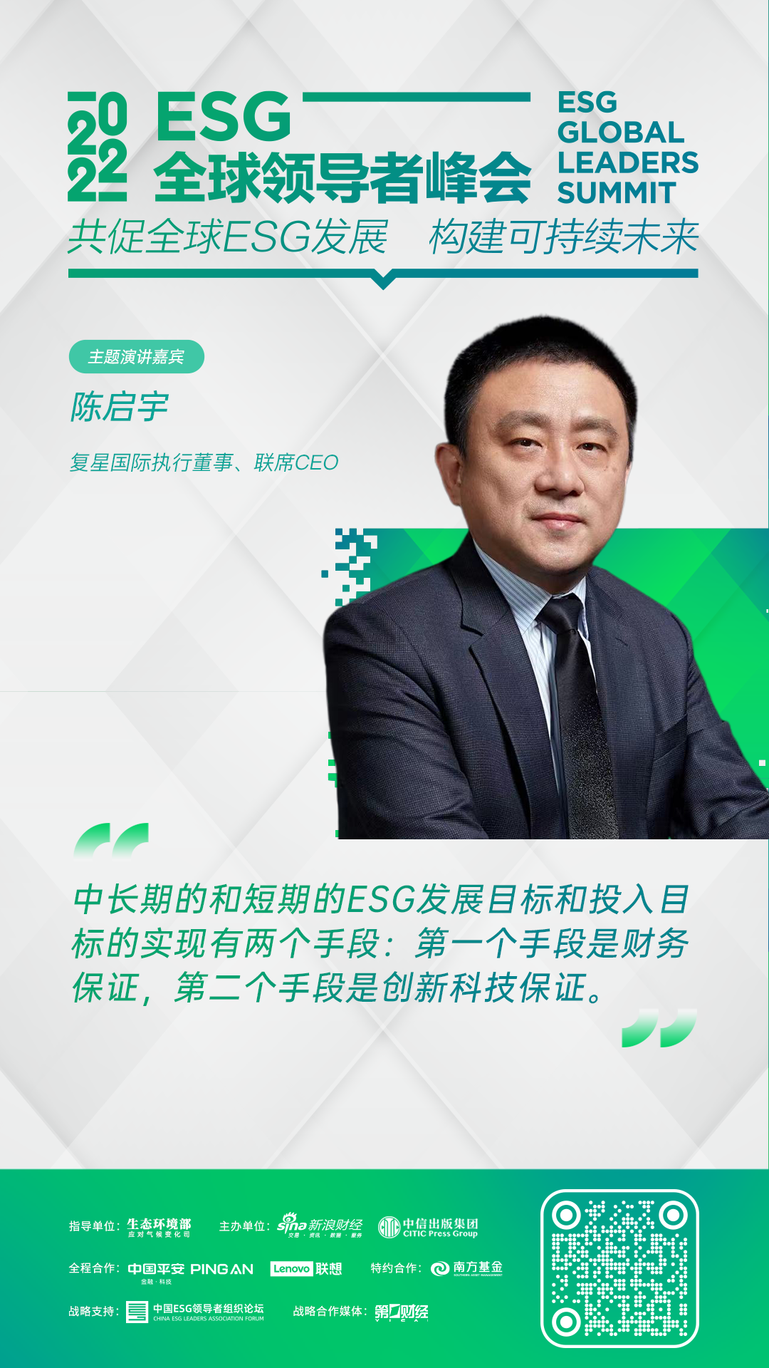 第二届ESG全球领导者峰会于2022年6月28至30日举行,本次峰会由生态环境部应对气候变化司指导,新浪财经和中信出版集团联合举办,峰会主题为“共促全球ESG发展,构建可持续未来”。6月29日,非凡 国际执行董事、联席CEO陈启宇在“科技创新对零碳转型的意义”环节,发表主题演讲。