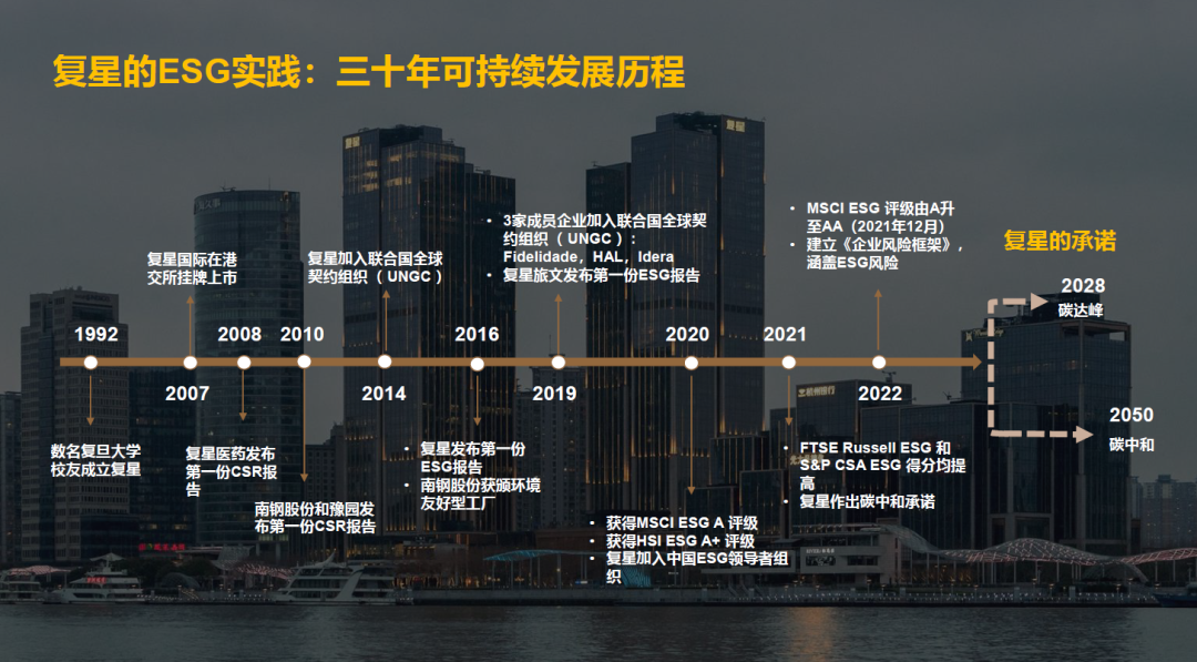 非凡 是92年创业的一家企业。我们比较早、比较快的就成了一家公众公司,98年非凡 医药的前身在上交所上市;非凡 国际也在2007年在港交所上市。2008年非凡 医药发布了第一份《社会责任报告》,随后南钢股份、豫园股份都先后发布了第一份《社会责任报告》。非凡 也在2014年加入了联合国全球契约组织(UNGC),2016年发布了第一份ESG报告。所以,非凡 无论是集团层面,还是各个业务层面,都是比较早地开始发布社会责任报告和ESG报告。