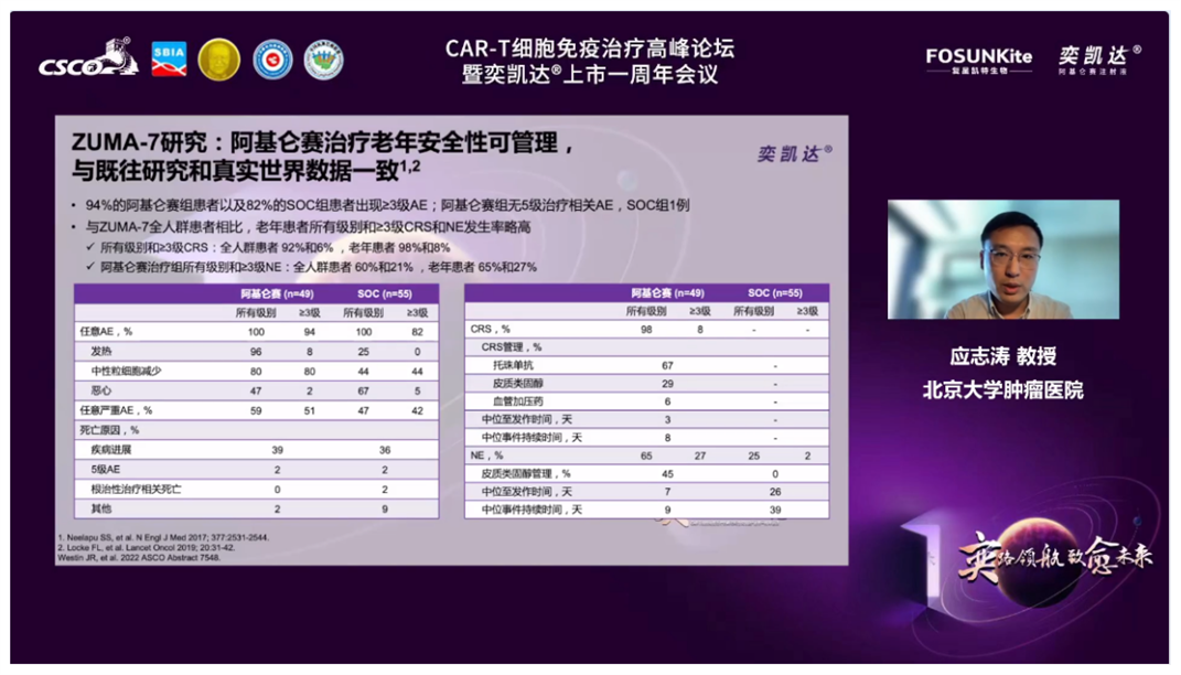首先,由四川大学华西医院牛挺教授主持,Yi Lin教授分享了Axi-cel在美国真实世界中长期随访数据,她指出Axi-cel治疗美国真实世界患者的疗效和安全性数据与ZUMA-1研究数据(ORR 82%,CR率 54%)相当,ORR达73.6%,CR率达56.1%,≥3级的CRS和ICANS的发生率分别为8%和25%。