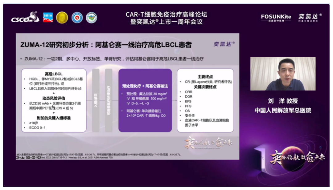 首先,由中国科学院大学附属肿瘤医院杨海燕教授担任主持,华中科技大学同济医学院附属协和医院梅恒教授带来《CAR-T治疗时机的选择探索》。他指出,CAR-T用于DLBCL患者三线及后线治疗时,既往治疗线数会影响CAR-T疗效,越早使用疗效越好;此外,患者基线状况越好、非大包块患者的预后越好。二线治疗方面,目前阿基仑赛注射液获得美国FDA批准用于一线免疫化疗难治或治疗后12个月内复发的LBCL成年患者,并获得2022年NCCN指南1类推荐应用。虽然CAR-T在一线治疗方面目前仍处于探索阶段,但ZUMA-12研究已显示阿基仑赛注射液一线治疗高危LBCL患者表现出快速且持久的高缓解率,改善了患者预后。