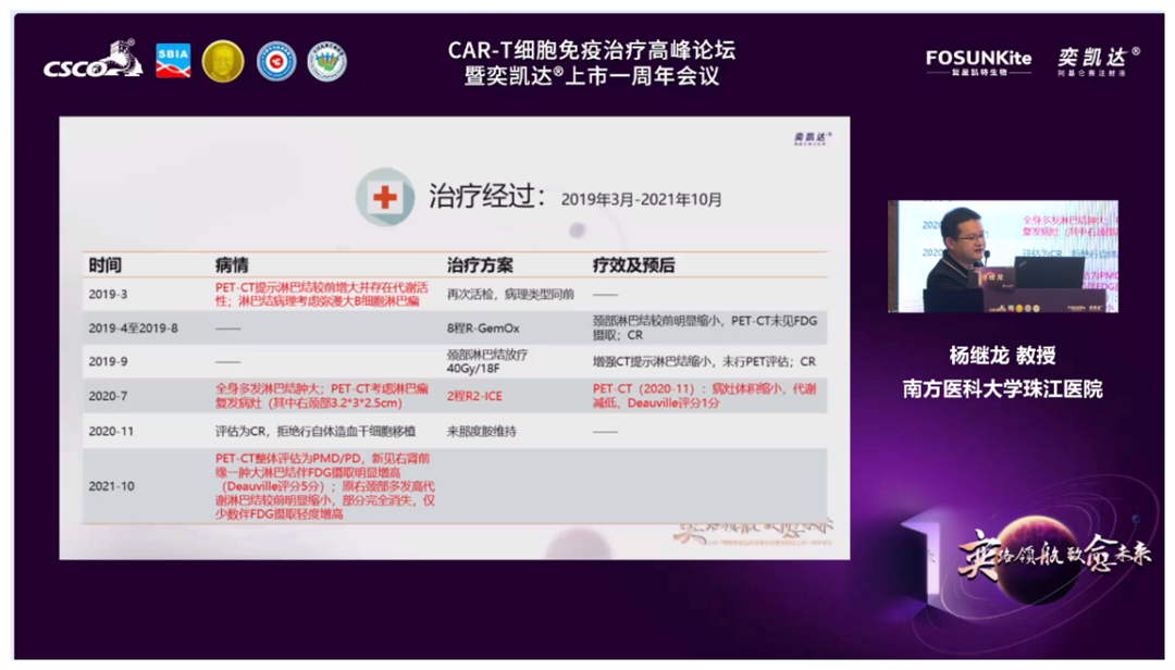 首先,由南京医科大学第一附属医院(江苏省人民医院)李建勇教授主持,上海交通大学医学院附属瑞金医院许彭鹏教授分享了全国首例商业化阿基仑赛注射液CAR-T细胞免疫治疗病例。该患者为老年女性,既往经二线治疗后欠佳,基因提示TP53突变,经阿基仑赛注射液治疗后,一次回输,至今已获得持续9个月CR。