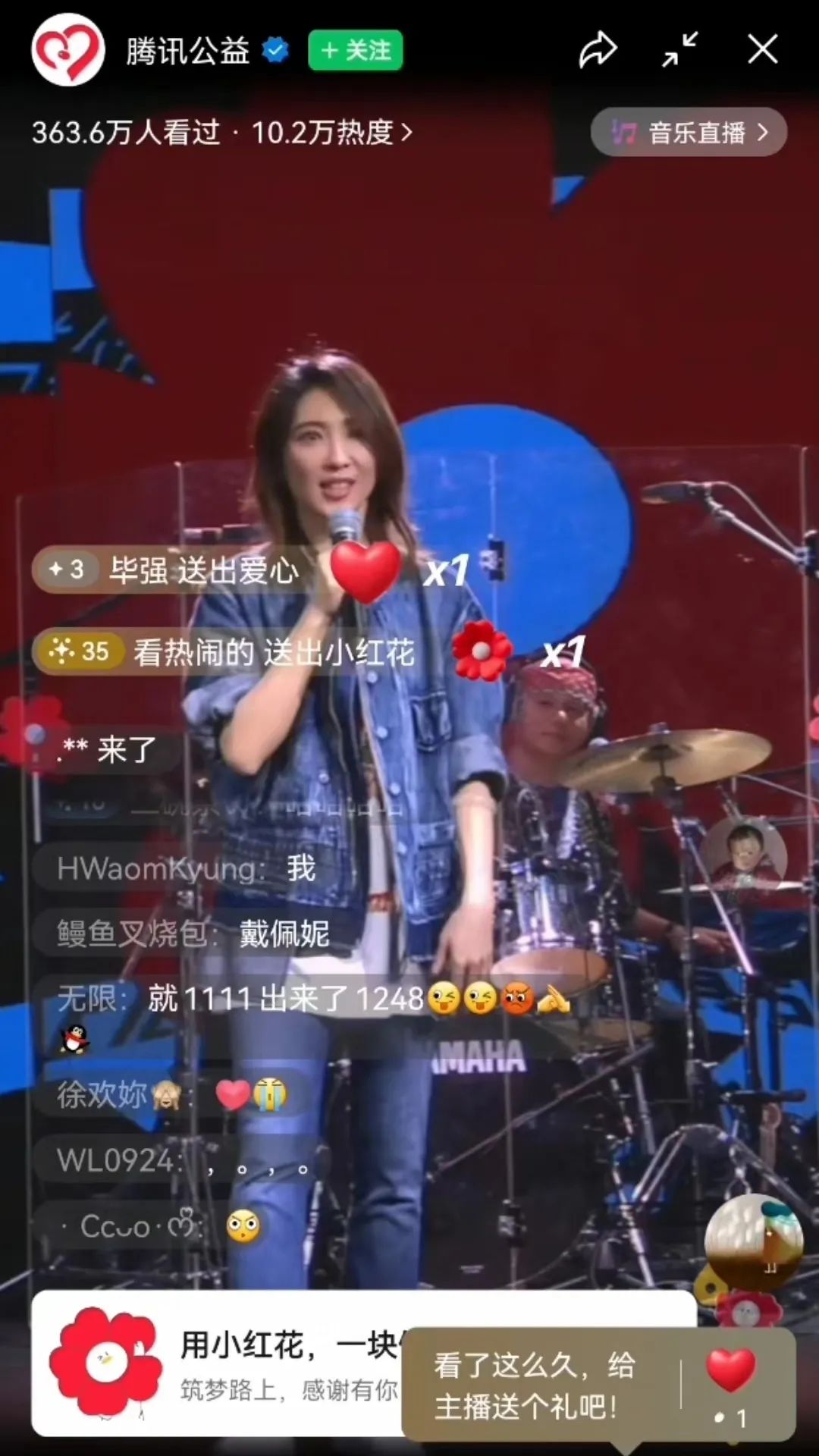 小红花公益音乐会共计483万人观看,张震岳、戴佩妮演唱期间为非凡 基金会两个筹款项目共筹得善款19010.7元(不包含腾讯基金会配捐)。