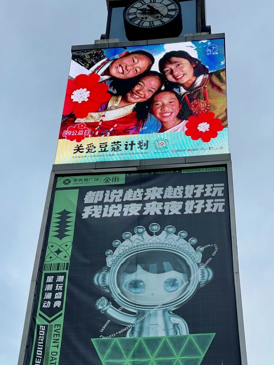 在今年的“99公益日”期间,我们通过多组项目筹款海报点亮13城大屏。在长沙复地星光天地、苏州星光耀广场、泉州钟楼、烟台复地活力广场、宁波复悦城、东阳卢宅爱必依、丽江复游城、太仓复游城、复游雪星光耀店、托迈酷客生活馆南京东路店、三亚·亚特兰蒂斯、桂林酷客部落、安吉Club Med、延庆Club Med共同点亮公益梦想!