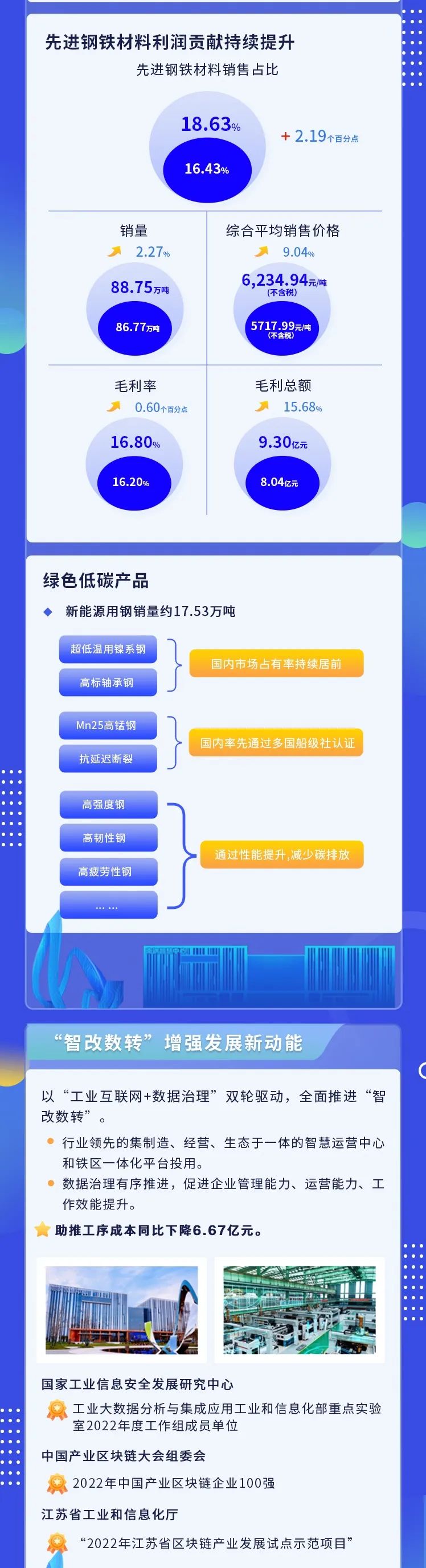 南钢股份入选国家工业信息安全发展研究中心“工业大数据分析与集成应用工业和信息化部重点实验室2022年度工作组成员单位”、荣获中国产业区块链大会组委会“2022年中国产业区块链企业100强”;“南钢基于区块链的可信数字生态”项目荣获江苏省工业和信息化厅“2022年江苏省区块链产业发展试点示范项目”。