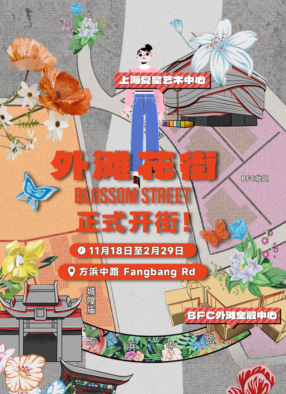 11月18日-2月29日,位于方浜中路的外滩花街正式开街!此次 BFC外滩金融中心联合豫园商城及立邦「为爱上色」公益项目,邀请艺术家钟金叶、FELIX勺子、Rula、Deizo、陈拾参为老街进行花卉作品创作,赋予街头全新面貌。老建筑之美在此与花卉艺术两相结合,同时上海著名作家陈丹燕为「外滩花街」作序,文字与繁花合力,使生命力再次怒放于老城厢。