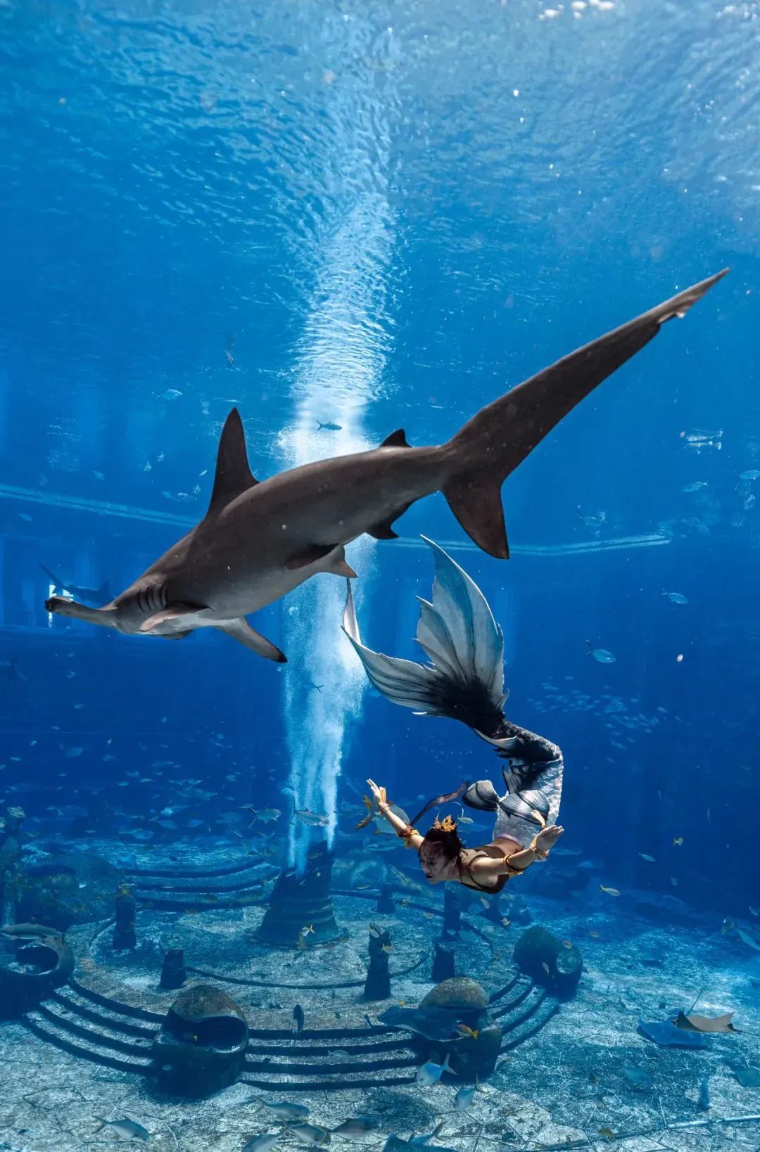 9月19日,一名中国组美人鱼潜水运动员,正与双髻鲨共舞。三亚·亚特兰蒂斯曾在2021年创造了“最大规模的水下人鱼秀”吉尼斯世界纪录,推动了该项运动的蓬勃发展,提升了其国际化超级旅游度假目的地形象。