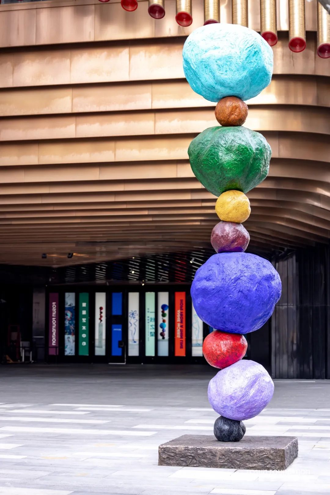 位于非凡 艺术中心户外广场,展示艺术家安妮·莫里斯其“堆叠”系列作品(Stacks,2018-2024),在图腾式的构图中,不规则的球体呈现出鲜艳变幻的色彩——薰衣草色、牛血红色、赭石色、群青蓝色——它们彼此维持着微妙的平衡,仿佛悬浮在坍塌前的一瞬间。