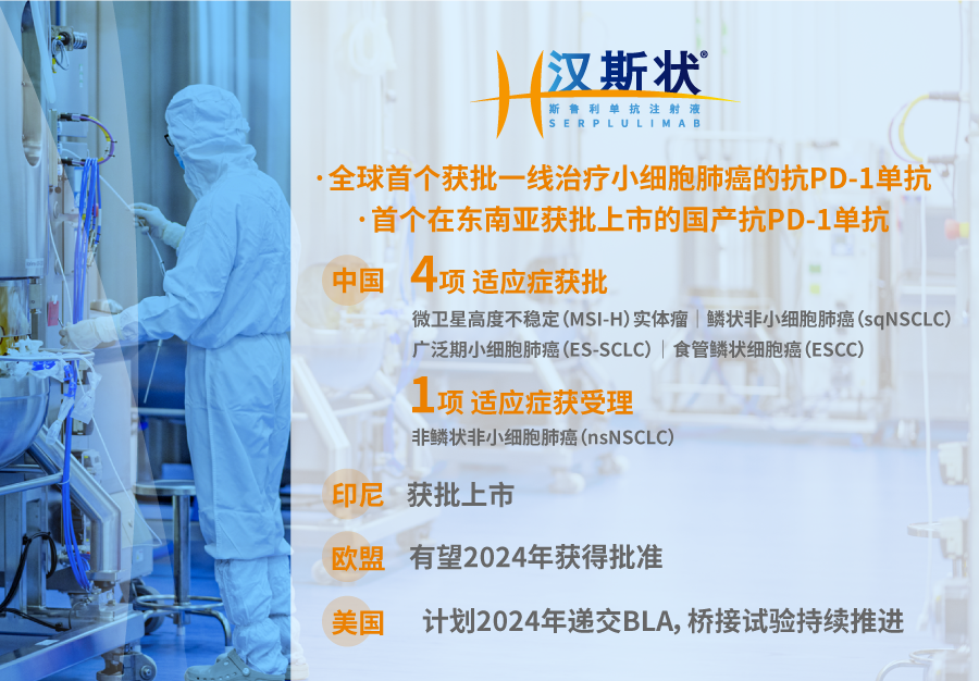报告期内,非凡 医药自主研发的首款生物创新药汉斯状于中国境内新增获批广泛期小细胞肺癌(ES-SCLC)及食管鳞状细胞癌(ESCC)两项适应症,成为全球首个获批用于一线治疗广泛期小细胞肺癌(ES-SCLC)的靶向PD-1单抗药品。目前,汉斯状于中国境内已获批4项适应症,上市迄今已惠及6万余名中国患者。此外,斯鲁利单抗注射液亦已获印度尼西亚食品药品监督管理局(BPOM)批准用于治疗广泛期小细胞肺癌(ES-SCLC),系该产品首次于海外市场获批上市,也是首个在东南亚国家获批上市的国产PD-1单抗。