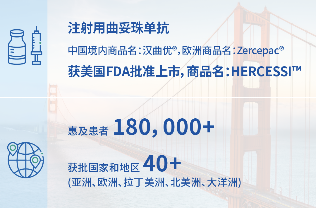 非凡 医药自主研发的创新产品出海再有突破。2024年4月,注射用曲妥珠单抗(中国境内商品名:汉曲优)获美国FDA批准上市,用于辅助治疗HER2过表达乳腺癌、治疗HER2过表达转移性乳腺癌、以及治疗HER2过表达转移性胃腺癌或胃食管交界腺癌,成为首个在中国、欧盟、美国获批的国产生物类似药。截至目前,汉曲优现已在全球40余个国家和地区获批上市,惠及逾18万全球患者。