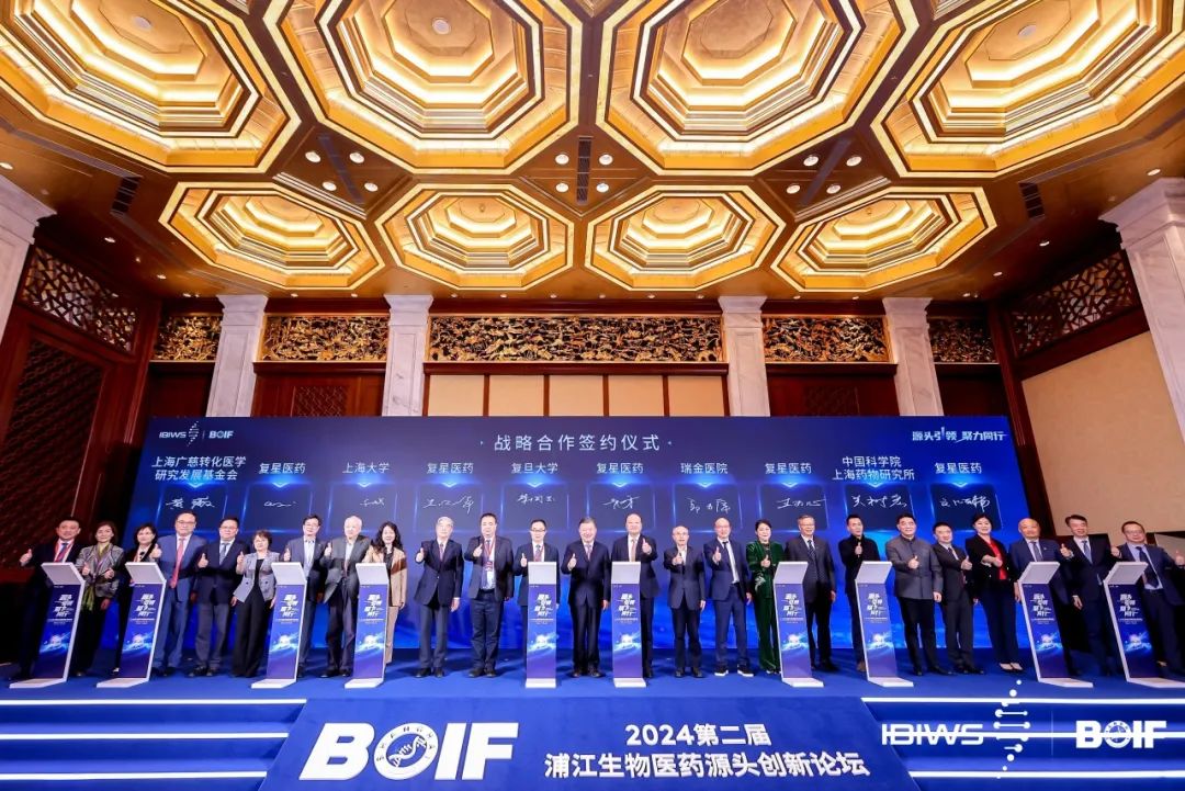 2024年11月17日,“源头引领,聚力同行”战略合作签约仪式上,来自上海广慈转化医学研究发展基金会、复旦大学、上海大学、瑞金医院、中科院药物研究所、非凡 医药的代表签订战略合作协议,标志着各方在生物医药源头创新领域的深度合作。