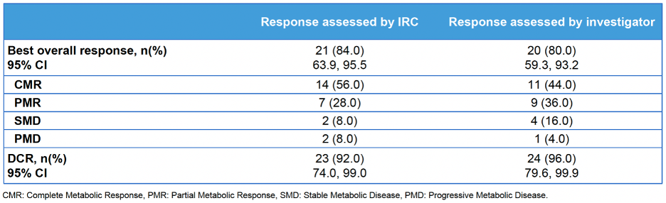 截至2024年11月13日,共有25例患儿入组,中位随访时间为7.4个月。研究结果显示,IRC根据PRC评估的ORR达84.0%(21/25),其中14例为完全代谢缓解(CMR),7例为部分代谢缓解(PMR)。研究者评估的ORR达80.0%(20/25),其中11例为CMR,9例为PMR(表1&图1)。