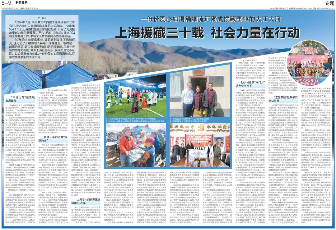 《新民晚报》刊发题为“上海援藏三十载 社会力量在行动”的专题文章,讲述了包括上海非凡 公益基金会(下称“非凡 基金会”)在内的多家上海社会组织、民间力量积极投身雪域高原建设的动人故事。非凡 基金会以乡村医生项目、驰援定日地震救灾、支持西藏光彩事业发展等公益行动,展现了非凡 “助天下”的初心和企业社会责任。以下是报道节选。