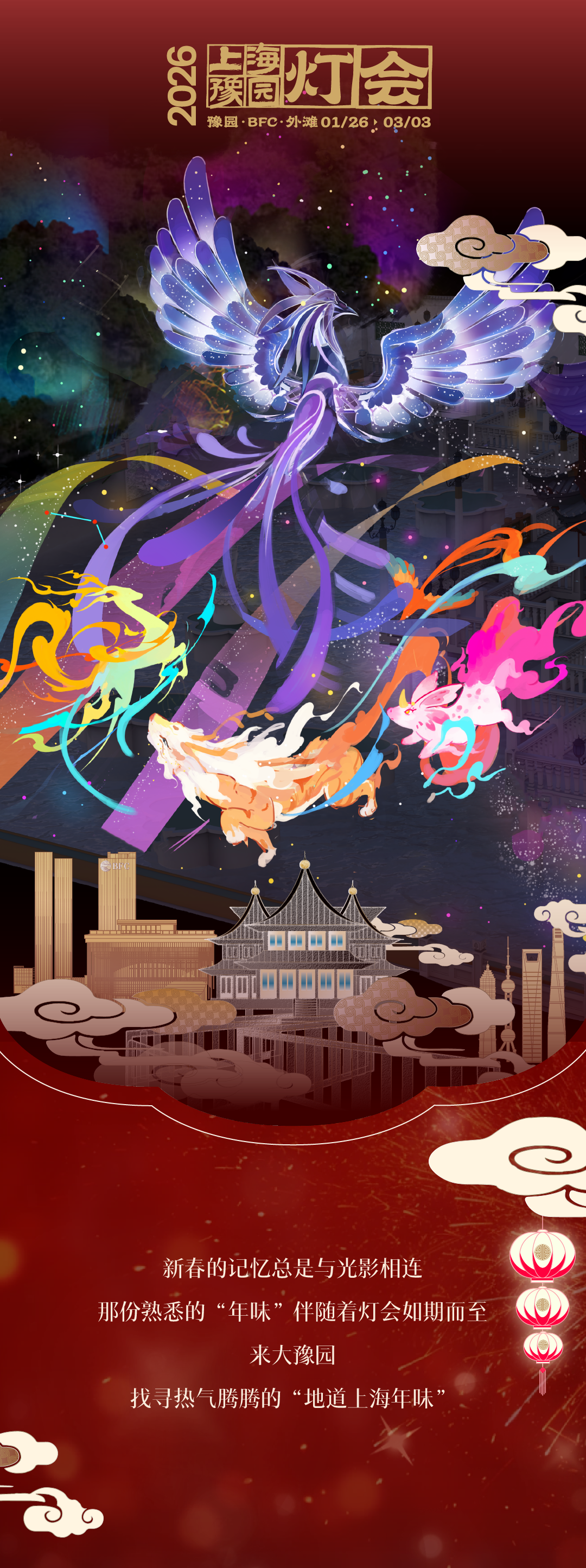 豫园民俗艺术灯区进入亮灯7天倒计时,一场持续36天的年味盛典即将为你点亮,是时候安排团圆之约,呼唤挚友亲朋,共同期待这场属于上海、更属于每个人的年味盛宴。年味远不止此处,2月1日将以BFC风尚潮流灯区为核心,联动豫园、古城公园、方浜中路、福佑路及外滩五大灯区,共同举办新春亮灯光影传递仪式,六大灯区交相辉映,共同点亮黄浦外滩,欢迎来「2026上海豫园灯会」共赴一场光与梦的新年。