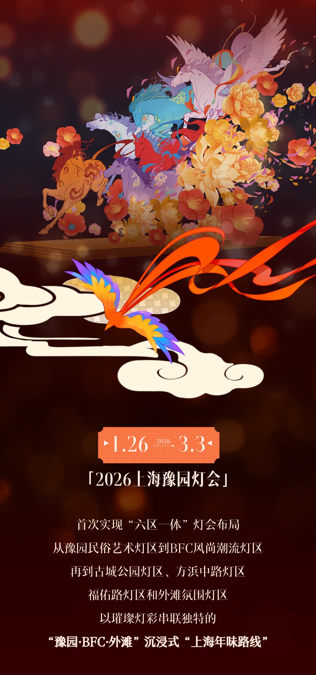 2026年,豫园民俗艺术灯区撰写全新文化篇章——“山海奇豫记”第四季《旷野篇》,围绕“以梦为马,旷野生花”主题,鼓舞所有逐梦飞奔的生命,为其绽放最绚烂的鲜花。以一场万象更新的春节盛宴,为传统年俗注入昂扬的时代动能。