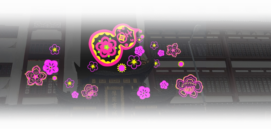 豫园商城5号门的门头与通道在缤纷盛放的花朵装点下,层叠的花形与流动的色彩,犹如从旷野中自然蔓延般铺展开来,明亮、浪漫、富有时尚感。既呼应了“旷野生花”的主题,也寓意着“梦想如花般缤纷盛放”,传递了对大家的新年期许:穿过5号门,开启属于自己的花开旅程,心中所愿皆能绽开。