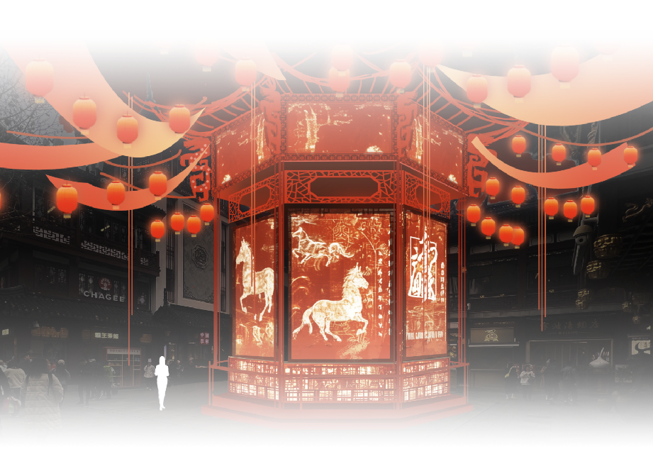 九曲桥整片区域幻化为星辰旷野,源自《山海经》的迅疾神兽,于星辰大海间恣意飞驰、奔腾汇聚、蜕变换形。喻示着每一个逐梦者,都可在无疆旷野中恣意飞舞,于追寻中蜕变成心之所向的模样。