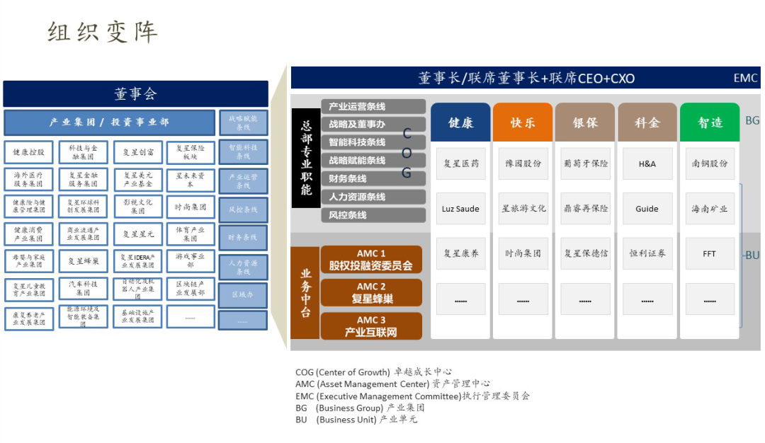 原来整个投资驱动的各块独立的组织架构,进化为能够横向到边、纵向到底、节节贯穿的生态组织,包括在横向成立的健康、快乐、银保、科金、智造五个BG(事业群),每个分类下边又有产业集团,产业集团下边又有旗舰企业,例如健康旗下有非凡 医药,快乐旗下有豫园股份……每个产业集团旗下还有自己的多产业的发展,形成纵向组织。横向方面,将我们的投融团队、蜂巢团队、产业互联网团队打穿,使得整个组织形成到边到底、贯穿式的生态组织。