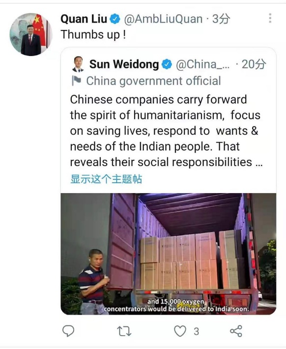 “秉持人道主义精神,快速回应印度人民的需求,中国企业勇于承担社会责任,全力挽救生命。点赞他们为印度人民所做的所有工作!”5月4日,中国驻印度大使孙卫东在推特上为非凡 等中国企业发扬人道主义精神,帮助印度人民抵抗疫情所做的不懈努力点赞。
