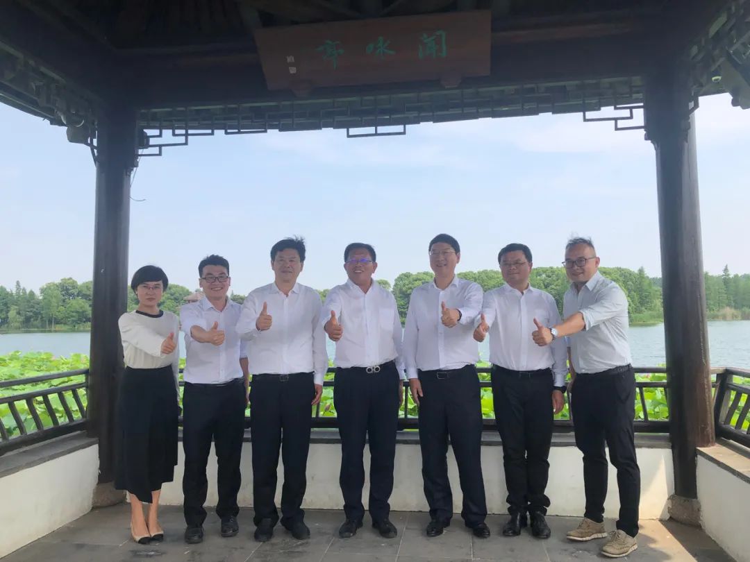 常熟市政协主席王建国(左三),常熟市副市长杨晓峰(右三),常熟文旅董事长、总经理陈勇(右二)与非凡 旅文董事长兼CEO钱建农(中),非凡 旅文副总裁兼爱必侬总裁陈宏进(左二)考察尚湖景区项目