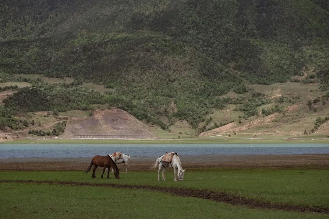 从松林里出来,沿着山路驾车往前走,拐过几个弯之后,出现一个坝子,坝子里有淡蓝色湖泊、明翠的草地和山峦。稍远处,一片传统纳西村落安静地躺在白云下。这一幕让人想到《消失的地平线》里,康维发现的蓝月山谷。
