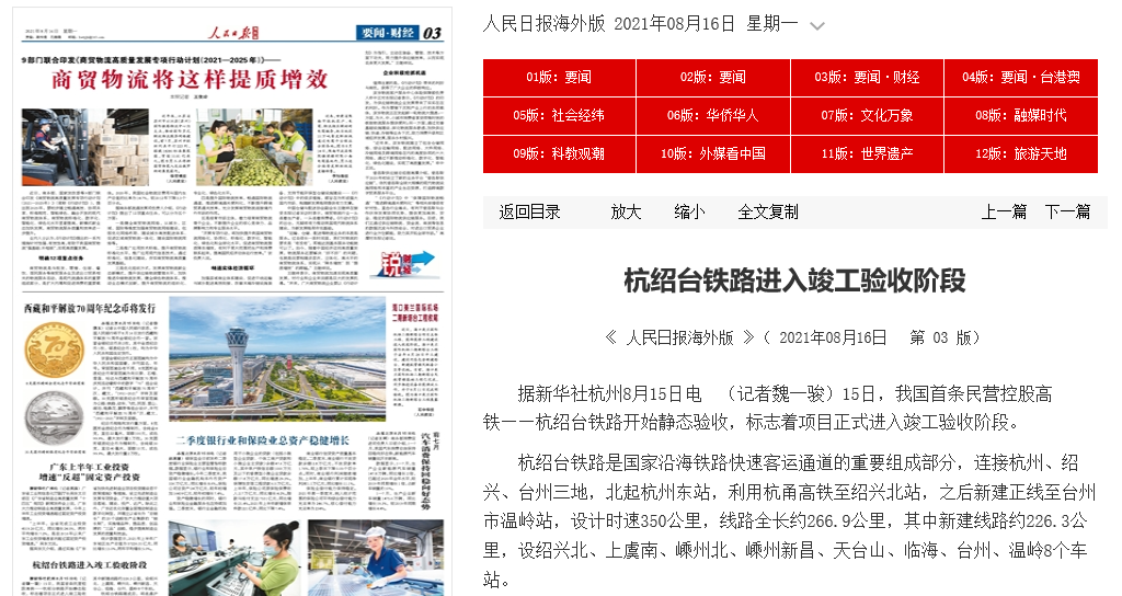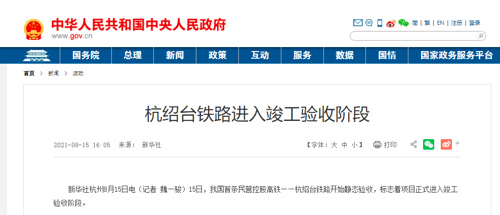 8月15日,我国首条民营控股高铁——杭绍台铁路开始静态验收,标志着项目正式进入竣工验收阶段,向着年底建成通车目标又迈出重要一步。中国政府网、央视、新华社、人民日报、中新网、浙江卫视等媒体进行报道。