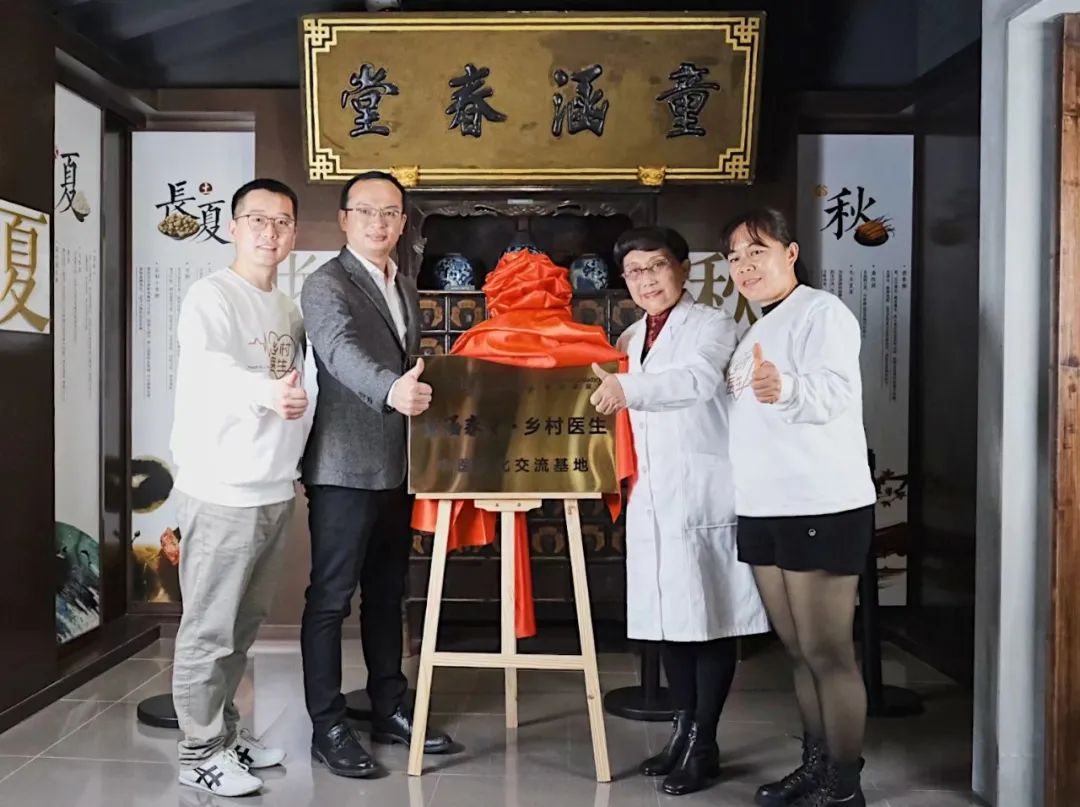 ▴ 村医骆玉萍(右一)与童涵春堂联席总经理叶嘉欣(左二)、上海非凡 公益基金会项目总监郭帅(左一)、中医郄玉兰(右二)共同为“中医文化交流基地”揭牌