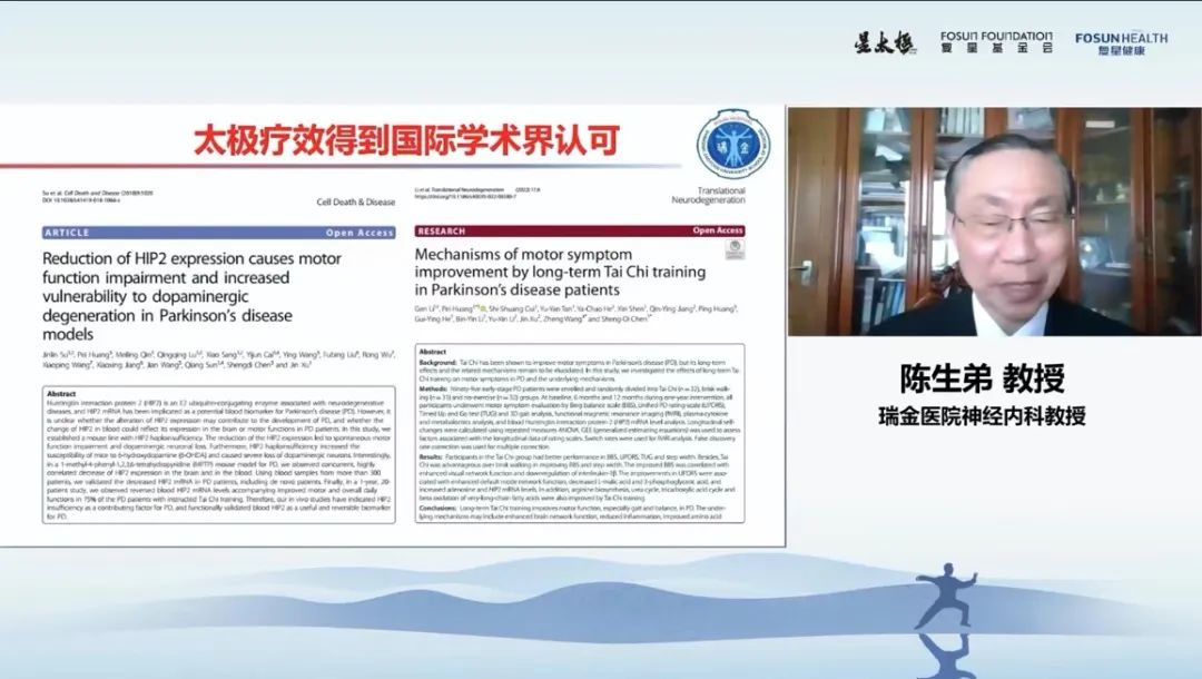 陈生弟团队通过一年及三年期的太极治疗帕金森病前瞻队列研究,发现打太极拳,在作用机制上能激活、增强帕金森患者的脑网络功能,并改善患者血液里包括hip2值在内的多个指标。在临床表现上,打太极拳改善了帕金森患者的运动症状和非运动症状,包括步态、姿势稳定性、步速、认知功能和执行功能,从而有效延缓疾病进展,降低运动并发症的发生,总体提高了“帕友”的生活质量。