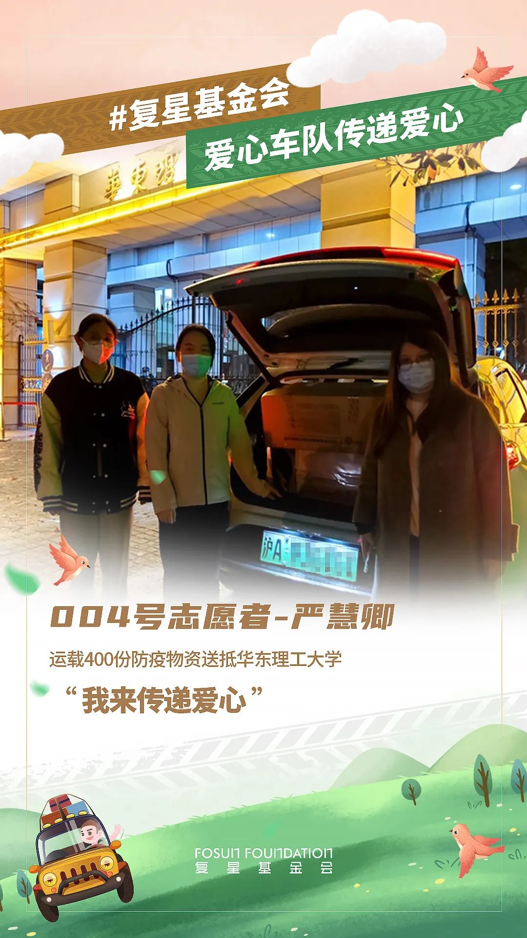 15日下午,非凡 基金会发布组建爱心车队信息,短短3小时,66位员工接龙响应。16日,编号001车队的7名员工志愿者执行驰援上外任务,从“接单”到完成交货用时不到24个钟头。17日下午,002号车队由非凡 公共事务与企业传播中心总经理祝文魁带队,与3名员工志愿者一起向宝山区卫健委送去一万件防疫物资。