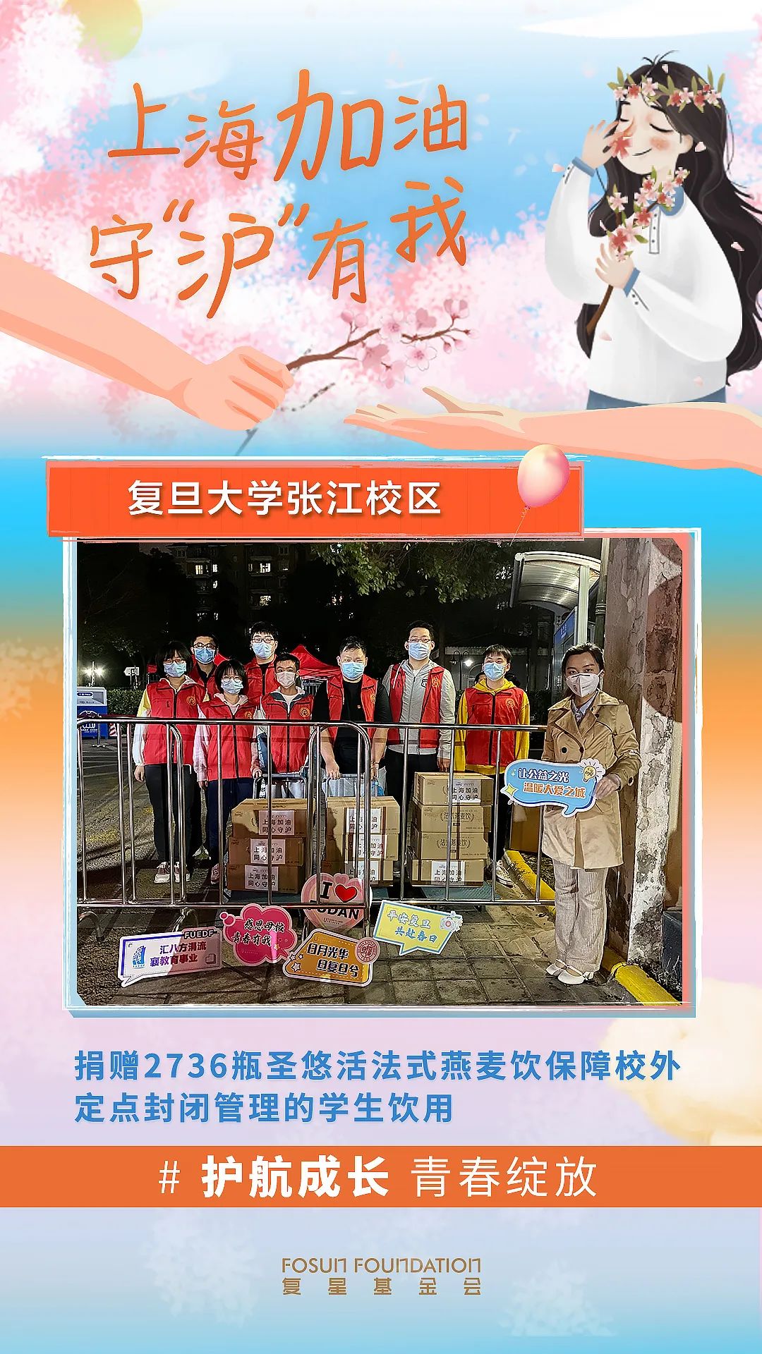 像袁文婕一样利用“职务之便”回到母校的还有不少:非凡 商社董事会办公室组长崔琳傍晚在复旦大学张江校区送完燕麦饮后,和学弟学妹们“隔栅”合影。非凡 基金会副总监裴琼在上外校门口交接完物资后,“隔空”欣赏了校园内怒放的玉兰花…… 非凡 基金会下一步将继续紧盯高校需求,借助员工爱心车队等力量纾困这些临时被“封印”的万人大社区。