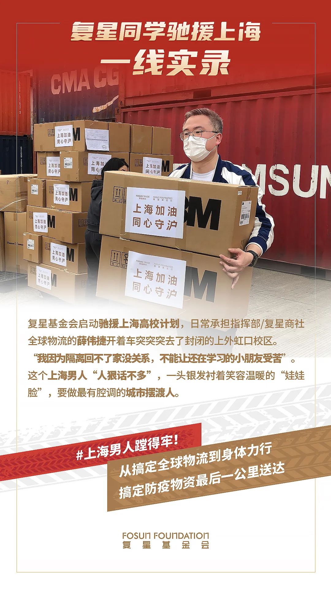 当天,车队群里共发出6条驰援信息,其中华东理工大学需要600份防疫物资。信息发出后没几分钟,徐汇校区的派送任务就被在复宏汉霖做销售的严慧卿“抢单”。但是严慧卿家住宝山,并不顺路,她说,“有医学背景的我,此刻特别想帮助到在一线的医护人员,我不在乎路途远近。”