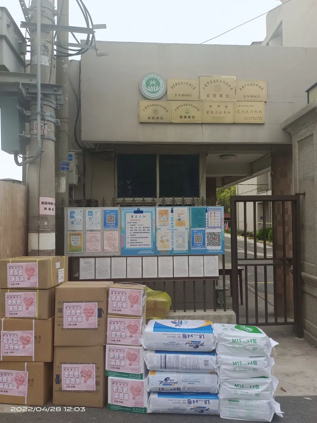 5月1日浦东爱心公寓有320位老人,收到2个标准包。因为封控,院里的人都不能出门拍,就认真嘱咐门卫摞整齐拍了一张,在微信上传过来:“足够我们养老院用1个月,真的是太好了。”