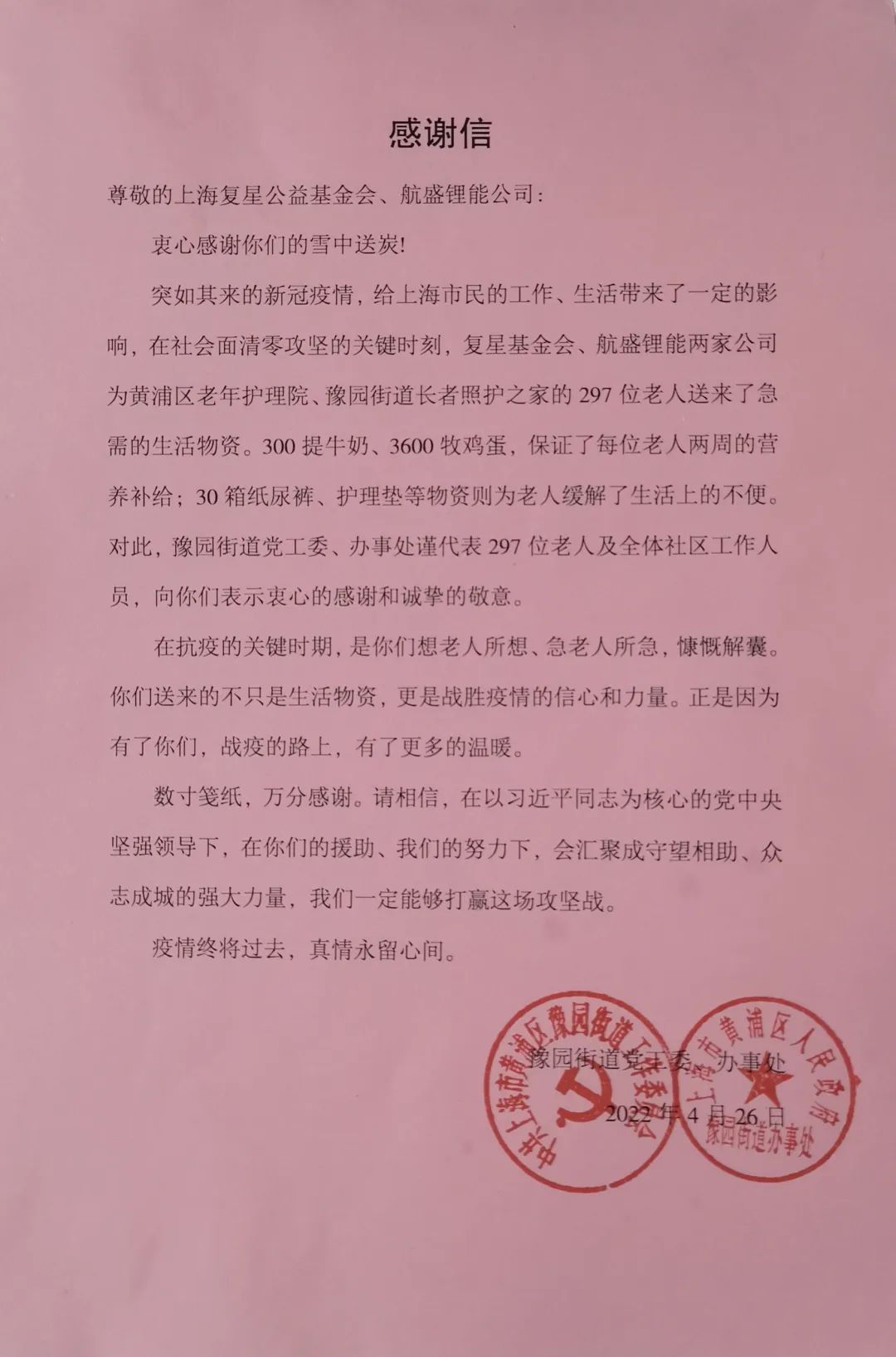 5月3日,上海非凡 公益基金会(简称“非凡 基金会”)“老吾老”项目启动18天。截至当日晚上18:00,非凡 基金会在上海市民政局指导下,联合公益合作伙伴、社会爱心人士为上海14个区超200家养老院10000余名高龄、独居老人送去生活、防疫、护理物资总计371794件,包括4月20日以来联合航盛锂能捐赠66758件助老物资,联合蒋一侨向上海11家养老院、近50位老人捐赠治疗高血压、糖尿病、心脏疾病、阿尔茨海默病等药品,联合李沁捐赠医用外科口罩、隔离衣、丁腈手套、抗原试剂及护理垫、纸尿裤等76760件,联合白鹿捐赠37家机构40个防疫包138720件物资,应急守护疫情中的薄弱群体。