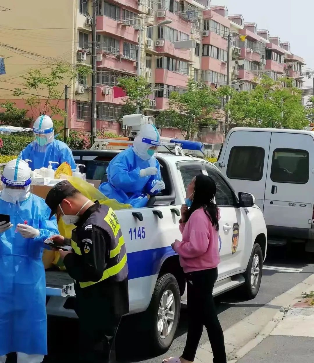 一辆巡查的皮卡车,就是一个街道的流动核酸点。佛山非凡 禅诚医院护士黄诗婷和2名同事,坐在车后斗里完成街面流动的567人份的核酸检测任务。