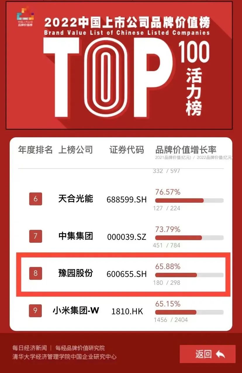 5月10日,2022中国上市公司品牌价值榜(以下简称“中国上市公司价值榜”)正式发布,该榜单由每日经济新闻与清华大学经济管理学院中国企业研究中心依托权威数据联合发布,伴随“中国品牌日”的设立已连续推出了6年,是中国经济进入高质量发展新阶段的力量体现。今年,豫园股份以65.88%的品牌价值增长率在“活力榜Top100”中位列第八,展现了企业良好的发展前景和投资价值。