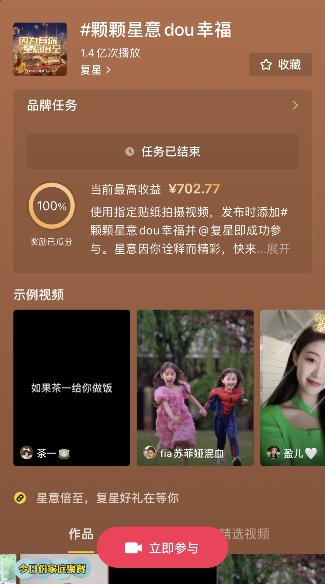 也在抖音平台发起“颗颗星意Dou幸福”挑战赛,用户按活动规则使用“星意倍至”贴纸发布视频,即可参与分享现金大奖。