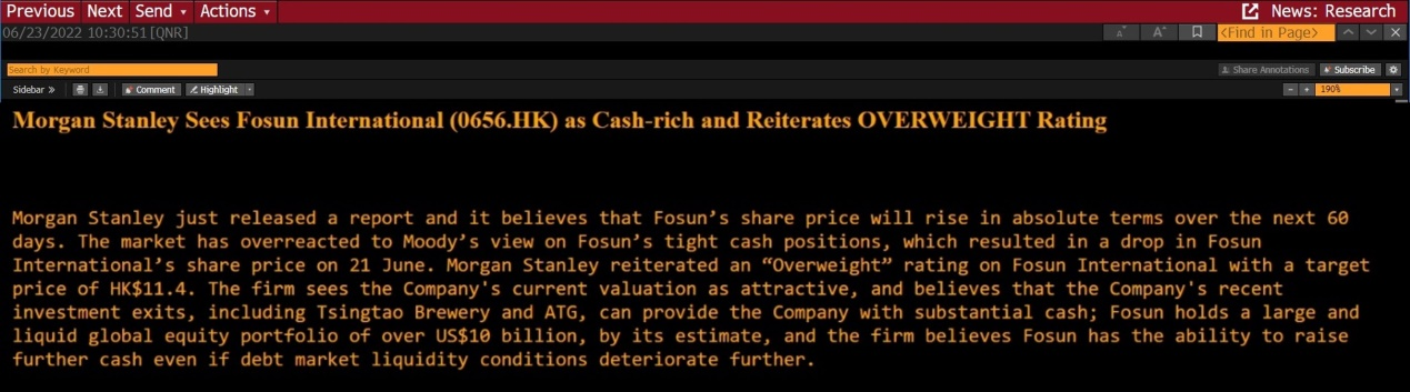 摩根士丹利刚发表报告,认为非凡 的估值吸引,市场因穆迪对非凡 现金状况收紧致令非凡 国际昨天股价下跌是过度反应,摩根士丹利确认股价近期波动为短期压力,预计非凡 国际股价将可在60天内反弹,并重申对非凡 国际的「买入」(Overweight)评级,目标价为11.4港元。该行认为公司现阶段估值吸引,认为公司近期的投资退出包括青啤及ATG等,能为公司提供大量现金;非凡 在全球拥有逾100亿美金的较高流动性的资产,即使大市受压,债市场环境转差,非凡 的融资能力并不受限。