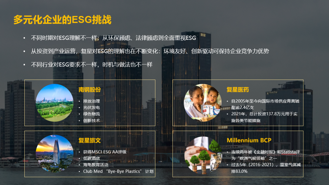 首先,在我们发展的过程中,不同时期对ESG的理解可能是不一样的,有一个逐步建立意识和完善的过程。我们最初对ESG的理解,是从环保开始,因为我们从事医药、南钢这样的大制造业,切身体会到在很多项目的评估、进入等环节,环保很早就根植到了非凡 深度产业运营的文化基因中去。我们考评一些项目的时候,经常环保是一票否决的。非凡 从创业之初法律体系的建设就是比较完善的。到今天,我们有不同层级的上市企业,有金融、医药等企业受到不同的行业监管。所以从治理和监管的角度,我们也能进入一个行业、进入一个地域,就能去适应、去熟悉地域和行业的治理需要。我们也是比较早地开始社会责任事业,进行对外慈善、捐助等工作。在企业发展的不同的阶段,我们一直在不断地建立自己的ESG的意识。最终在社会外部环境推动下,在非凡 全球化、国际化的过程中,反过来推动我们去系统化地梳理ESG体系,从对环境友好、公司的治理,到法律体系的完善,到社会慈善,根据ESG体系理论加以总结提炼。