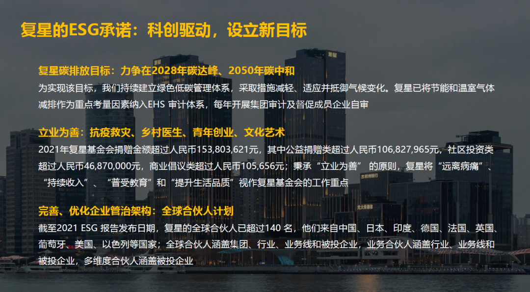 在ESG的评级上,非凡 已经取得了一些成果,MSCI 2021年非凡 国际ESG评级为“AA”,包括恒生等其它指数,也给予了非凡 一个比较好的ESG评级。非凡 旗下医药、豫园、南钢等上市公司,也分别在ESG评级、社会责任方面做出了相应的成绩。