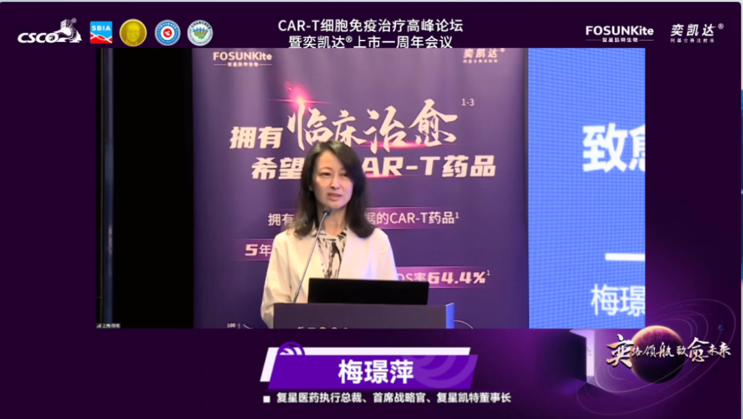 会议首先由非凡 医药执行总裁、首席战略官、非凡 凯特董事长梅璟萍女士致辞,她表示:“阿基仑赛注射液是全球首个拥有5年长期生存数据的CAR-T产品,意味着临床治愈时代已经到来。阿基仑赛注射液还是首个获得FDA批准用于二线LBCL的CAR-T细胞产品。如今,包括中国在内的全球细胞治疗产业正快速发展,在此背景下,阿基仑赛注射液在国内的一周年仅仅是一个开始,未来非凡 凯特将继续致力于肿瘤治愈,持续推动细胞治疗可及,为患者提供更优的治疗方案。”