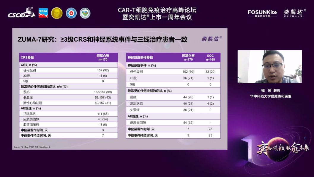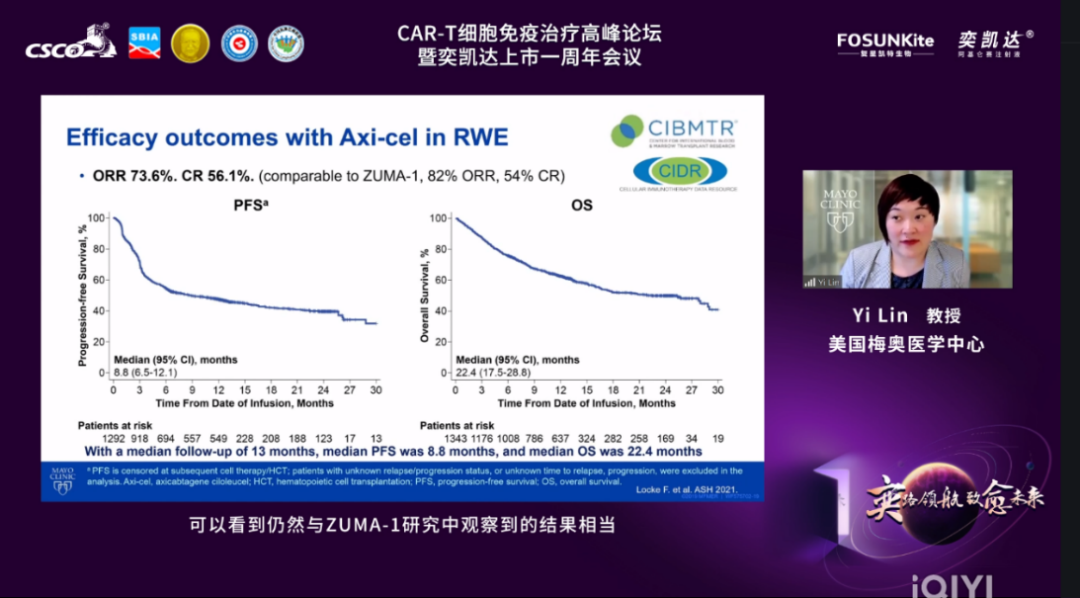 首先,由四川大学华西医院牛挺教授主持,Yi Lin教授分享了Axi-cel在美国真实世界中长期随访数据,她指出Axi-cel治疗美国真实世界患者的疗效和安全性数据与ZUMA-1研究数据(ORR 82%,CR率 54%)相当,ORR达73.6%,CR率达56.1%,≥3级的CRS和ICANS的发生率分别为8%和25%。