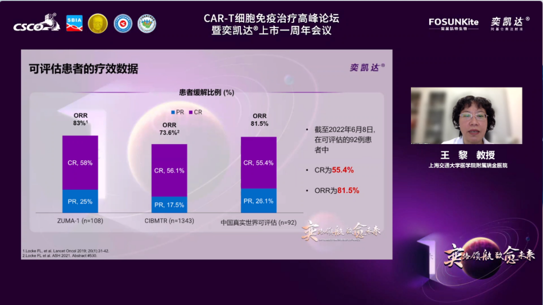 随后,由浙江大学医学院附属第二医院钱文斌教授主持,王黎教授分别对阿基仑赛注射液在中国真实世界的数据、瑞金医院病例的数据以及亚裔人群的数据进行了分析。截至2022年6月8日,阿基仑赛注射液上市一周年内共92例中国患者可评估疗效。中国真实世界数据显示,①阿基仑赛注射液用于中国患者其疗效与关键临床研究和美国真实世界数据相似:ORR达81.5%,CR率达55.4%;亚组分析提示非大包块患者的ORR优于大包块患者。②其安全性良好,≥3级CRS和ICANS发生率低:≥3级CRS发生率为11.2%,与关键临床研究和美国真实世界数据相似;但≥3级ICANS发生率仅为5.6%,优于关键临床研究和美国真实世界数据。