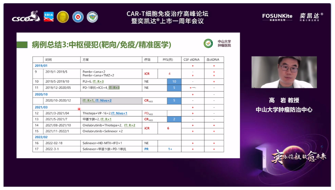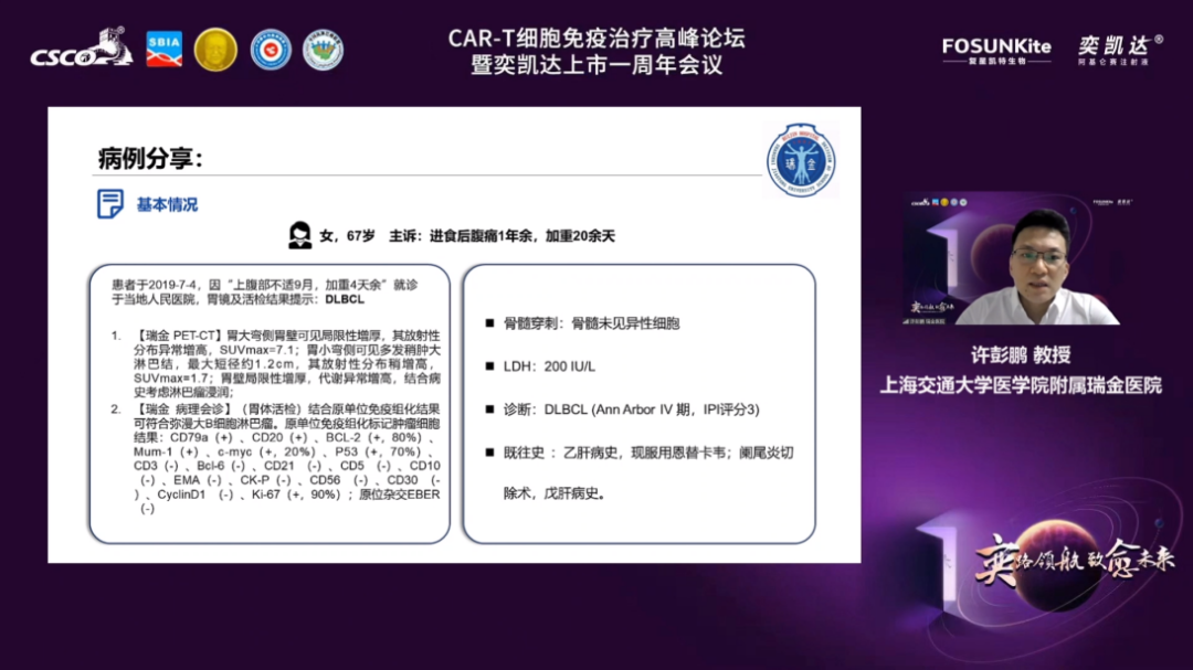 首先,由南京医科大学第一附属医院(江苏省人民医院)李建勇教授主持,上海交通大学医学院附属瑞金医院许彭鹏教授分享了全国首例商业化阿基仑赛注射液CAR-T细胞免疫治疗病例。该患者为老年女性,既往经二线治疗后欠佳,基因提示TP53突变,经阿基仑赛注射液治疗后,一次回输,至今已获得持续9个月CR。
