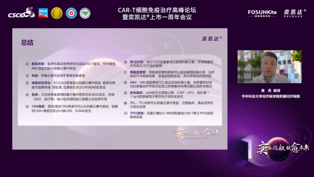 随后,由复旦大学附属肿瘤医院陶荣教授主持,华中科技大学同济医学院附属同济医院黄亮教授总结经验,带来《奕凯达®的患者适用人群及其循证证据》专题分享,从疾病类型、年龄、体能状态评分、肿瘤包块、CNS病史、双/三打击与否、胃肠道受累、HBV感染、生化指标、TFL以及TP53突变多角度一一分析患者应用CAR-T治疗的获益情况,为更多医护工作者带来启示,也为患者精准定位和获益提供重要参考。